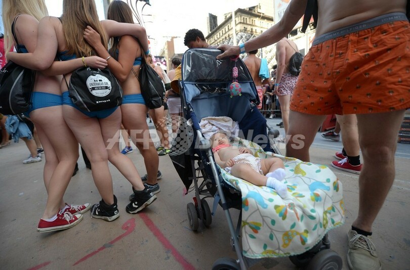 米ニューヨーク(New York)のタイムズスクエア(Times Square)で5日、「下着姿での最多集合人数」のギネス世界記録(Guinness World Records)への挑戦が行われた。これまでの記録は2270人(2013年8月5日撮影)。(c)AFP/Emmanuel Dunand