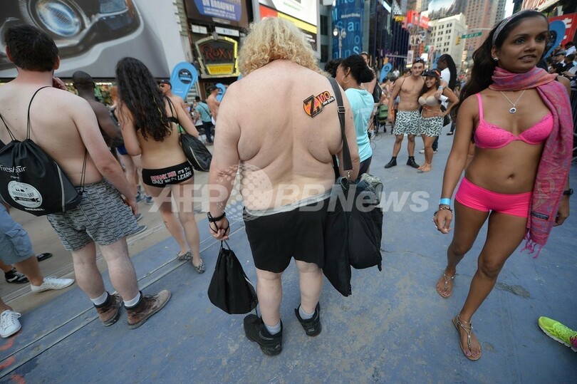 米ニューヨーク(New York)のタイムズスクエア(Times Square)で5日、「下着姿での最多集合人数」のギネス世界記録(Guinness World Records)への挑戦が行われた。これまでの記録は2270人(2013年8月5日撮影)。(c)AFP/Emmanuel Dunand