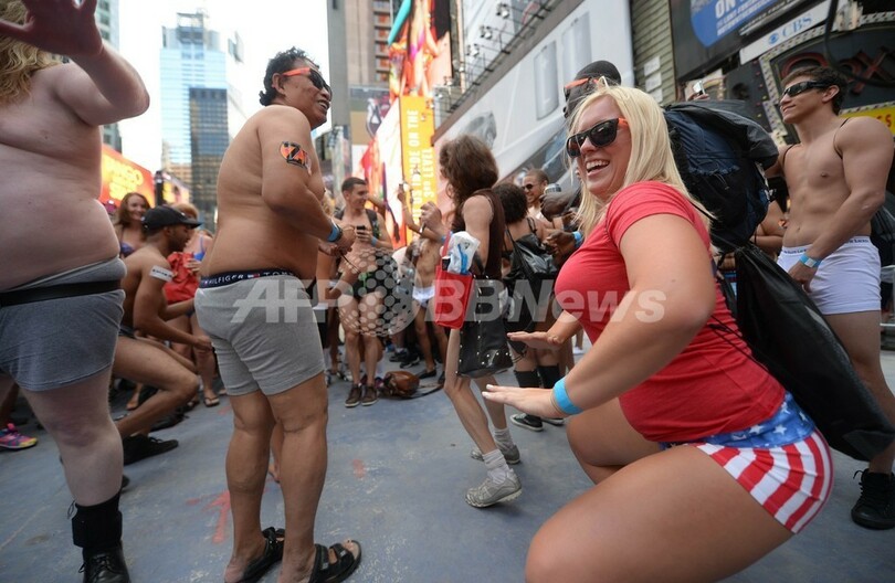 米ニューヨーク(New York)のタイムズスクエア(Times Square)で5日、「下着姿での最多集合人数」のギネス世界記録(Guinness World Records)への挑戦が行われた。これまでの記録は2270人(2013年8月5日撮影)。(c)AFP/Emmanuel Dunand