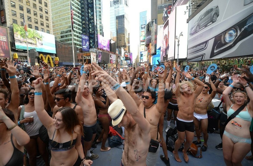 米ニューヨーク(New York)のタイムズスクエア(Times Square)で5日、「下着姿での最多集合人数」のギネス世界記録(Guinness World Records)への挑戦が行われた。これまでの記録は2270人(2013年8月5日撮影)。(c)AFP/Emmanuel Dunand
