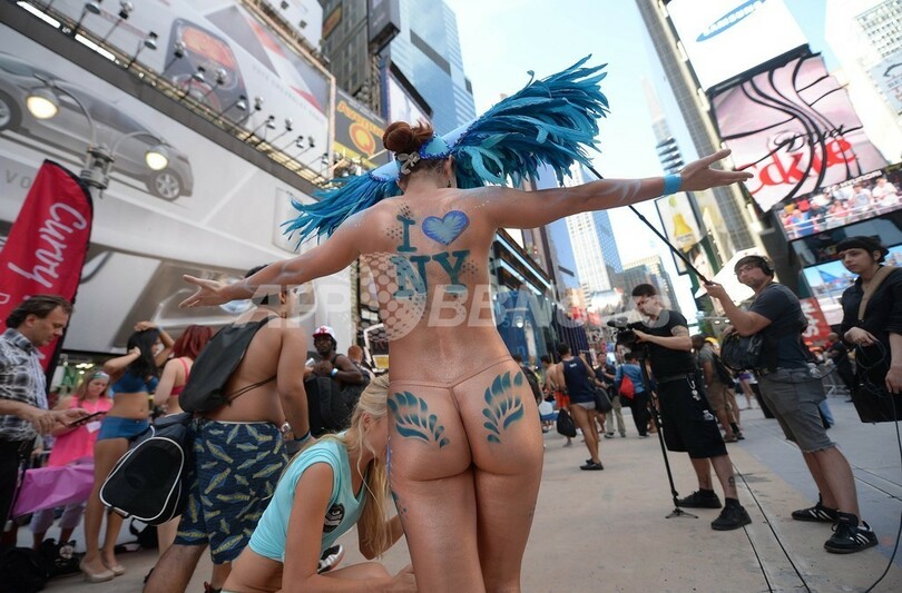 米ニューヨーク(New York)のタイムズスクエア(Times Square)で5日、「下着姿での最多集合人数」のギネス世界記録(Guinness World Records)への挑戦が行われた。これまでの記録は2270人(2013年8月5日撮影)。(c)AFP/Emmanuel Dunand