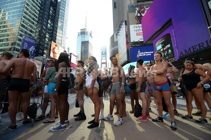 米ニューヨーク(New York)のタイムズスクエア(Times Square)で5日、「下着姿での最多集合人数」のギネス世界記録(Guinness World Records)への挑戦が行われた。これまでの記録は2270人(2013年8月5日撮影)。(c)AFP/Emmanuel Dunand
