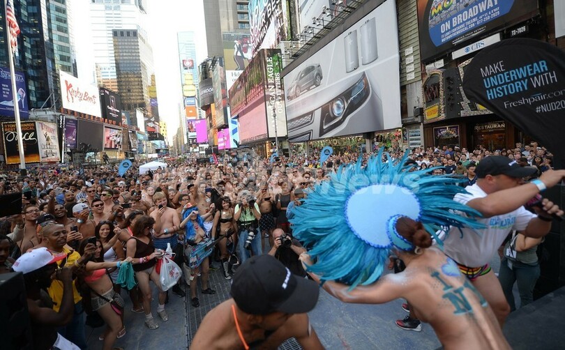 米ニューヨーク(New York)のタイムズスクエア(Times Square)で5日、「下着姿での最多集合人数」のギネス世界記録(Guinness World Records)への挑戦が行われた。これまでの記録は2270人(2013年8月5日撮影)。(c)AFP/Emmanuel Dunand