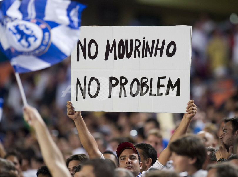 チェルシーのジョゼ・モウリーニョ(Jose Mourinho)監督に向けられたメッセージを掲げるファン(2013年8月7日撮影)。(c)AFP/Don Emmert