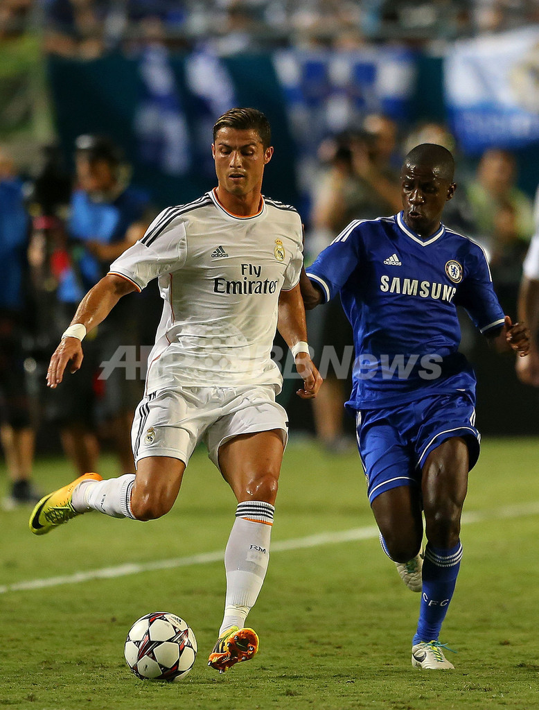 ボールを競るチェルシーのラミレス(Ramires Santos do Nascimento、右)レアル・マドリードのクリスティアーノ・ロナウド(Cristiano Ronaldo、2013年8月7日撮影)。(c)AFP/Getty Images/Mike Ehrmann