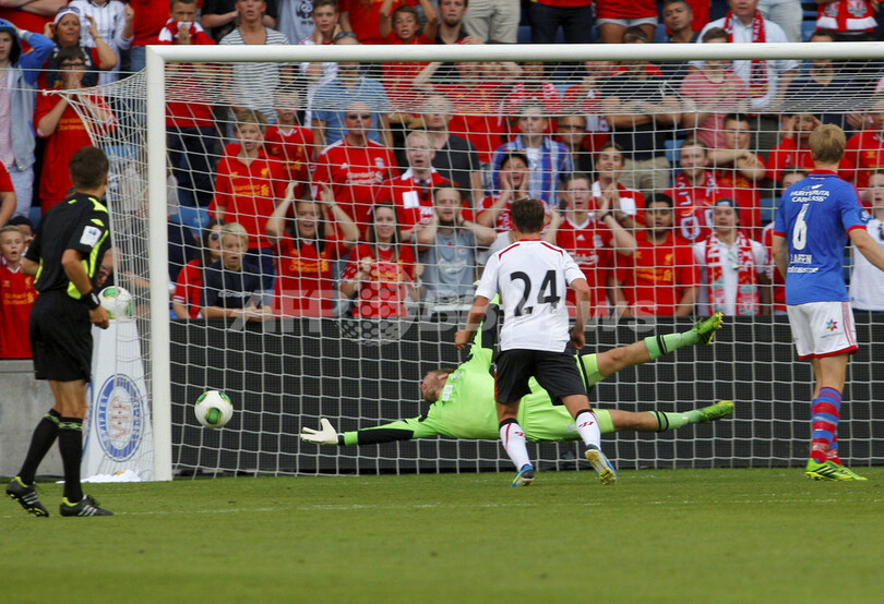 ノルウェー・オスロ(Oslo)で行われた試合で、リバプールは、ルイス・アルベルト(Luis Alberto)、イアゴ・アスパス(Iago Aspas)、マーティン・ケリー(Martin Kelly)、ラヒーム・スターリング(Raheem Sterling)がそれぞれ得点を挙げた。(c)AFP