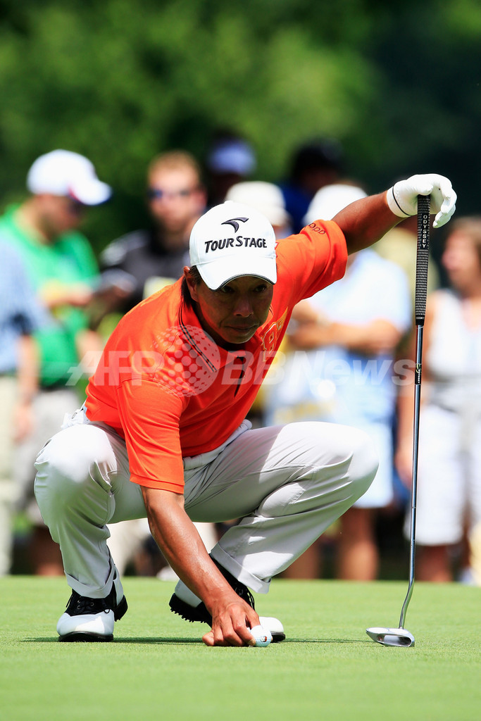 1番のグリーン上でパットラインを読む井戸木鴻樹(2013年8月8日撮影)。(c)AFP/Getty Images/Sam Greenwood