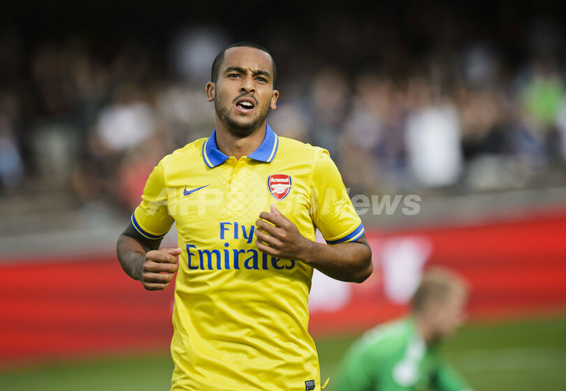 先制点を挙げ喜ぶアーセナルのセオ・ウォルコット(Theo Walcott、2013年8月10日撮影)。(c)AFP/LEHTIKUVA/MIKKO STIG