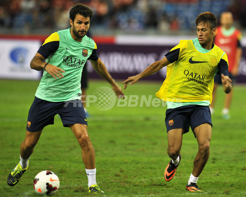 トレーニングに臨むセスク・ファブレガス(Cesc Fabregas、左)とネイマール(Neymar da Silva Santos Junior、2013年8月9日撮影)。(c)AFP/MOHD RASFAN