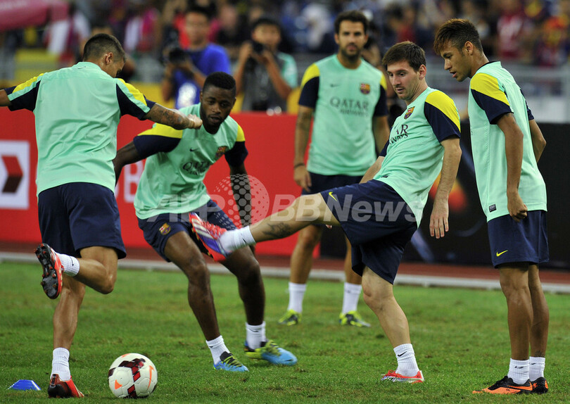 トレーニングに臨むネイマール(Neymar da Silva Santos Junior、右)、リオネル・メッシ(Lionel Messi、右から2人目)ら選手(2013年8月9日撮影)。(c)AFP/MOHD RASFAN