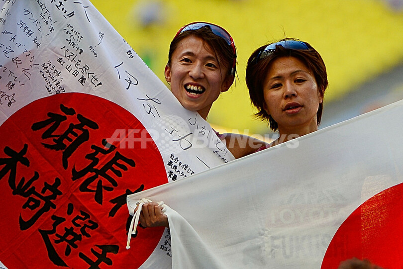 4位に入った木崎良子(Ryoko Kizaki)と一緒に日の丸を掲げる福士加代子(2013年8月10日撮影)。(c)AFP/OLIVIER MORIN