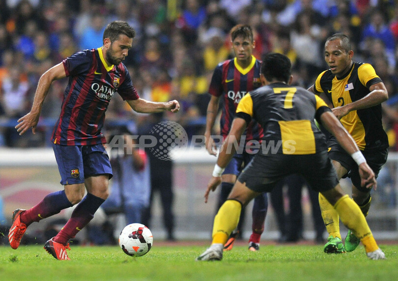 マレーシア選抜の選手に囲まれるFCバルセロナのジョルディ・アルバ(Jordi Alba、2013年8月10日撮影)。(c)AFP/MOHD RASFAN
