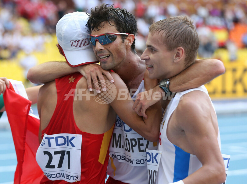 レース終了後、互いの健闘をたたえ合う(左から)陳定(Chen Ding、チェン・ディン)、ミゲル・アンヘル・ロペス(Miguel Angel Lopez)、アレクサンドル・イワノフ(2013年8月11日撮影)。(c)AFP/FRANCK FIFE