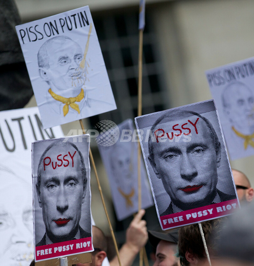 写真は、デモ行進する人たちが掲げたロシアのウラジーミル・プーチン(Vladimir Putin)大統領の顔写真を使ったポスター(2013年8月10日撮影)。(c)AFP/ANDREW COWIE