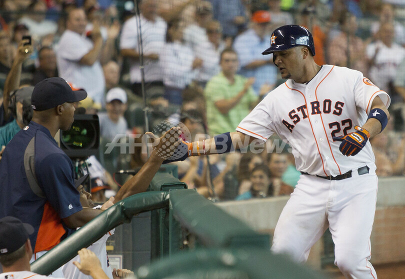 本塁打を放ち、ボー・ポーター(Bo Porter)監督(左)に祝福されるヒューストン・アストロズのカルロス・コーポラン(Carlos Corporan、2013年8月12日撮影)。(c)AFP/Getty Images/Bob Levey