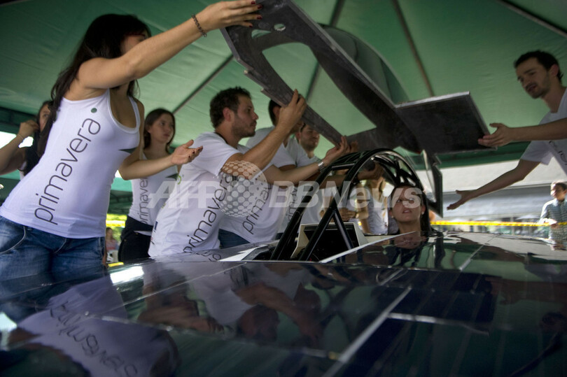【8月14日 AFP】南米コロンビアのアンティオキア(Antioquia)州メデジン(Medellin)で12日、同国エアフィット大学(EAFIT University)のソーラーカーチーム「Eafit-Epm」が新作ソーラーカーを発表会した。同大工学部の学生が手掛けたもので、10月6日からオーストラリアで行われる「ワールド・ソーラー・チャレンジ(World Solar Challenge)」に挑戦する。(c)AFP