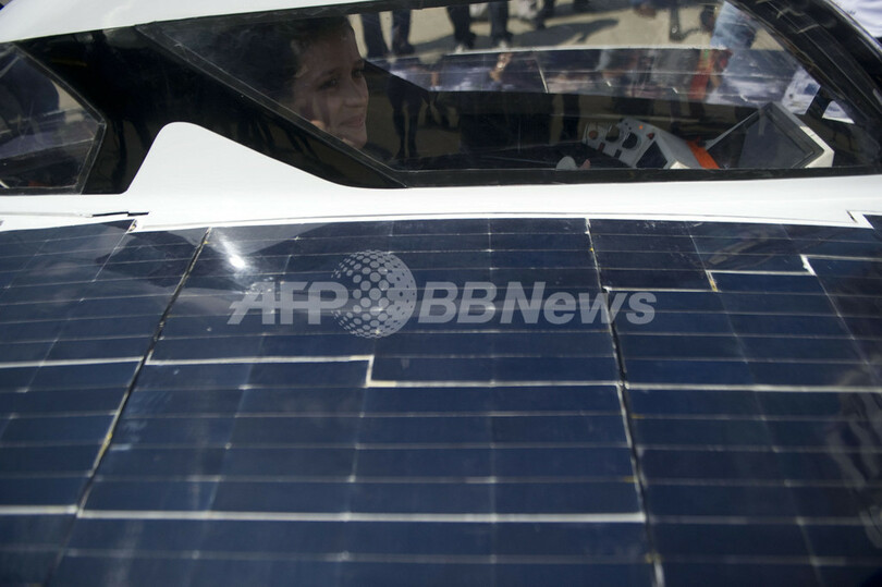 写真は、ソーラーカーを運転する学生(2013年8月12日撮影)。(c)AFP/Raul ARBOLEDA