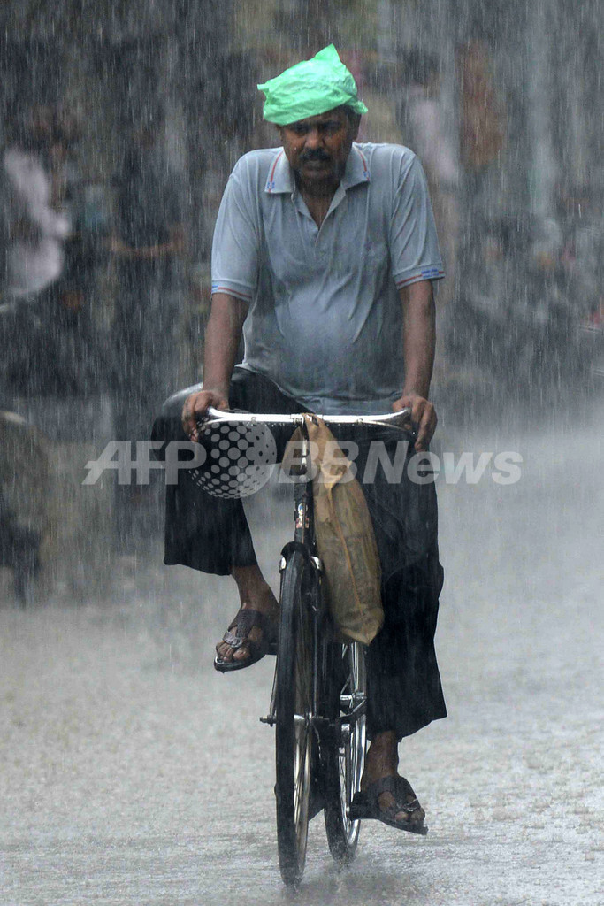 【8月14日 AFP】夏季の季節風(モンスーン)がもたらす降雨が続くインド各地で13日、土砂降りの中でも路上で果物を売る女性や、自転車やバイクで移動する人たちの姿が見られた。