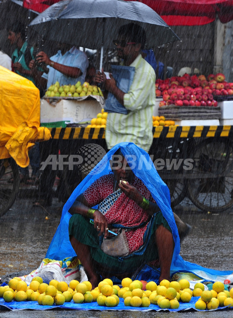 【8月14日 AFP】夏季の季節風(モンスーン)がもたらす降雨が続くインド各地で13日、土砂降りの中でも路上で果物を売る女性や、自転車やバイクで移動する人たちの姿が見られた。