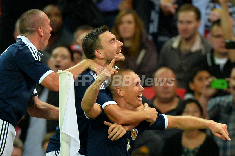 後半5分に勝ち越しゴールを決め歓喜するスコットランドのケニー・ミラー(Kenny Miller、右、2013年8月14日撮影)。(c)AFP/BEN STANSALL