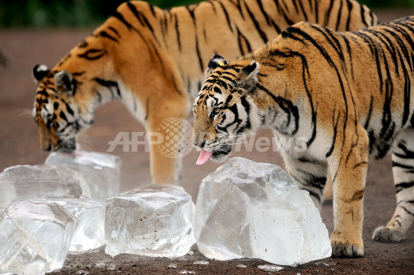 【8月15日 AFP】中国北東部の遼寧(Liaoning)省・瀋陽(Shenyang)にある「怪坡東北虎林園(Guaipo Siberian Tiger Park)」では12日、シベリアトラ(アムールトラ)が氷の塊をなめて涼をとる姿が見られた。