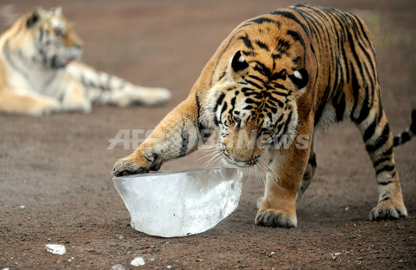 ひたすら氷ペロペロ、猛暑をしのぐシベリアトラ 中国