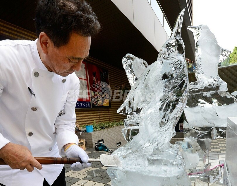 夏休みで訪れた来館者に一時の涼を楽しんでもらおうとの企画で、氷のペンギン彫刻を手掛けたのは、品川プリンスホテル(Prince Hotel Shinagawa)のシェフで元アイスカービング世界チャンピオンの佐々木正彦(Masahiko Sasaki)さん。同水族館の館長、アフリカペンギン(ケープペンギン)の「あおちゃん」も出席し、ひんやり冷たいペンギンの群れと「共演」した。(c)AFP