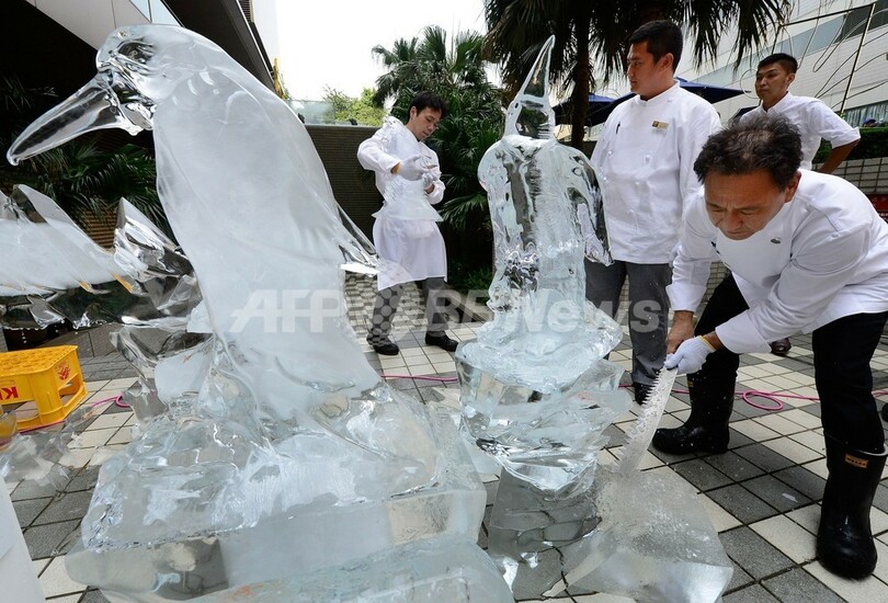 夏休みで訪れた来館者に一時の涼を楽しんでもらおうとの企画で、氷のペンギン彫刻を手掛けたのは、品川プリンスホテル(Prince Hotel Shinagawa)のシェフで元アイスカービング世界チャンピオンの佐々木正彦(Masahiko Sasaki)さん。同水族館の館長、アフリカペンギン(ケープペンギン)の「あおちゃん」も出席し、ひんやり冷たいペンギンの群れと「共演」した。(c)AFP