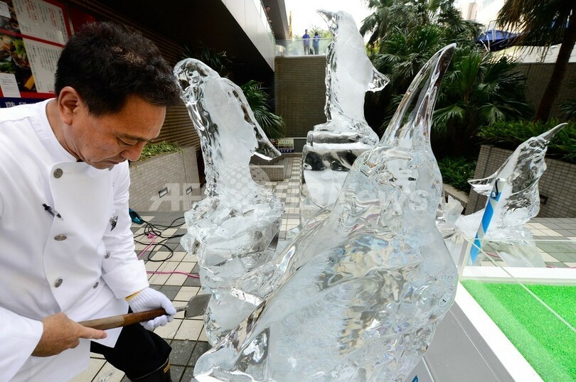 夏休みで訪れた来館者に一時の涼を楽しんでもらおうとの企画で、氷のペンギン彫刻を手掛けたのは、品川プリンスホテル(Prince Hotel Shinagawa)のシェフで元アイスカービング世界チャンピオンの佐々木正彦(Masahiko Sasaki)さん。同水族館の館長、アフリカペンギン(ケープペンギン)の「あおちゃん」も出席し、ひんやり冷たいペンギンの群れと「共演」した。(c)AFP