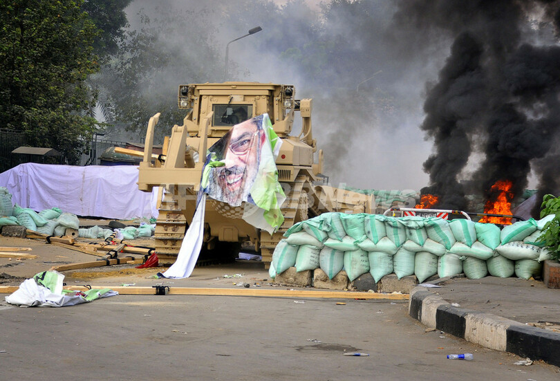 写真はナハダ広場で、デモ隊が築いたバリケードを突破するブルドーザー(2013年8月14日撮影)。(c)AFP/ENGY IMAD