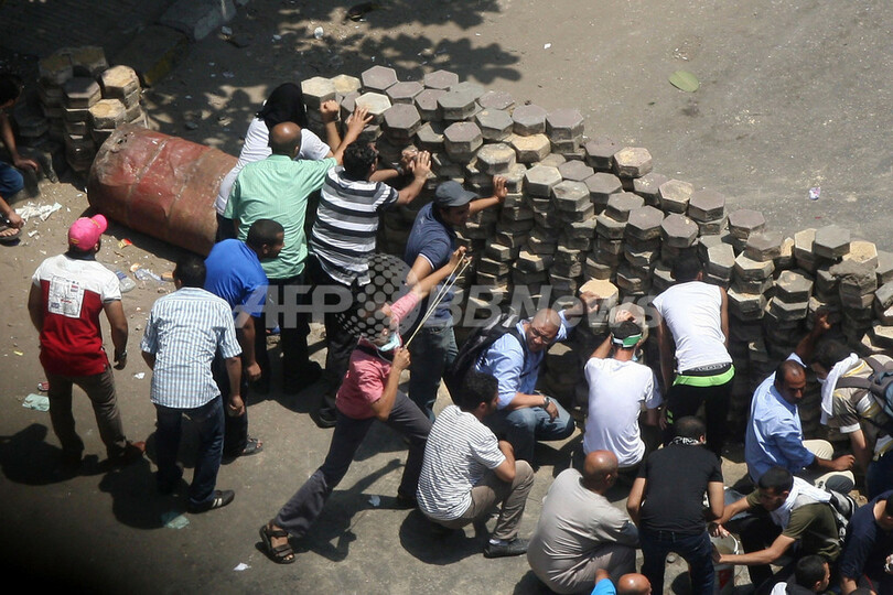 写真は強制排除の後、カイロのムスタファ・マフムード(Mustafa Mahmoud)広場で治安部隊と対峙するモルシ氏支持者ら(2013年8月14日撮影)。(c)AFP