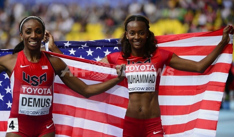 星条旗を持ってメダル獲得を喜ぶラシンダ・デュマス(左)とダリラ・ムハンマド(2013年8月15日撮影)。(c)AFP/OLIVIER MORIN