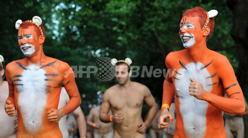 【8月16日 AFP】英ロンドン(London)にあるロンドン動物園(London Zoo)で15日、大胆にも裸で園内を走るというチャリティーマラソン大会が開かれた。このイベントは、ロンドン動物学会(Zoological Society of London)が行う絶滅の危機に瀕したスマトラトラの保護活動のために資金を集めようと企画されたもので、イベント中には、トラ模様を全身に描いて走る参加者の姿も見られた。(c)AFP