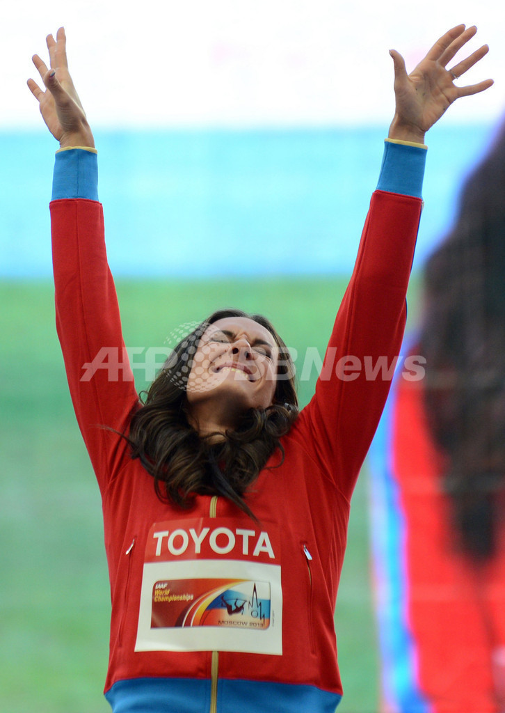 表彰台で歓喜するロシアのエレーナ・イシンバエワ(Yelena Isinbayeva、2013年8月15日撮影)。(c)AFP/KIRILL KUDRYAVTSEV