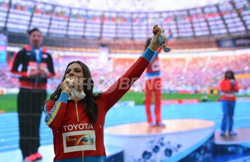 表彰台で歓喜するロシアのエレーナ・イシンバエワ(Yelena Isinbayeva、2013年8月15日撮影)。(c)AFP/KIRILL KUDRYAVTSEV
