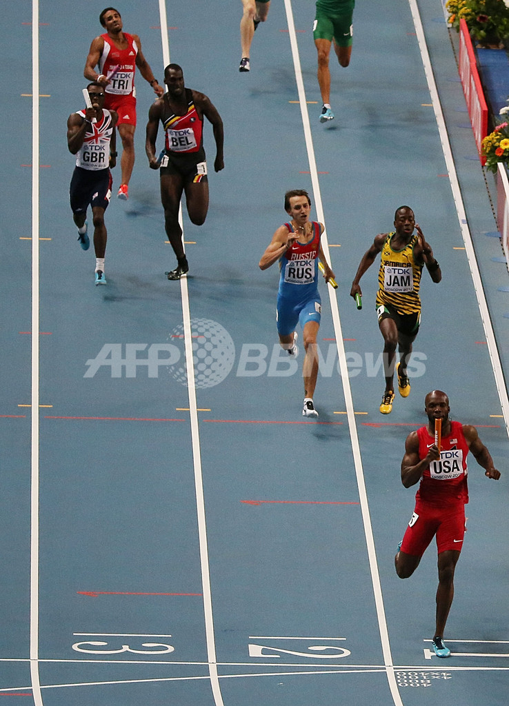 ジャマイカが2分59秒88で2位に、ロシアが2分59秒90で3位に入った。(c)AFP