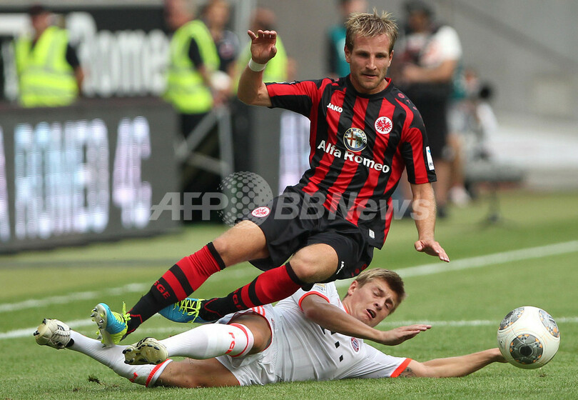 フランクフルトのシュテファン・ アイグナー(Stefan Aigner、上)と競り合うバイエルン・ミュンヘンのトニ・クロース(Toni Kroos、2013年8月17日撮影)。(c)AFP/DANIEL ROLAND