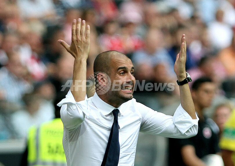 戦況を見守りながらジェスチャーするバイエルン・ミュンヘンのジョゼップ・グアルディオラ(Josep Guardiola)監督(2013年8月17日撮影)。(c)AFP/DANIEL ROLAND