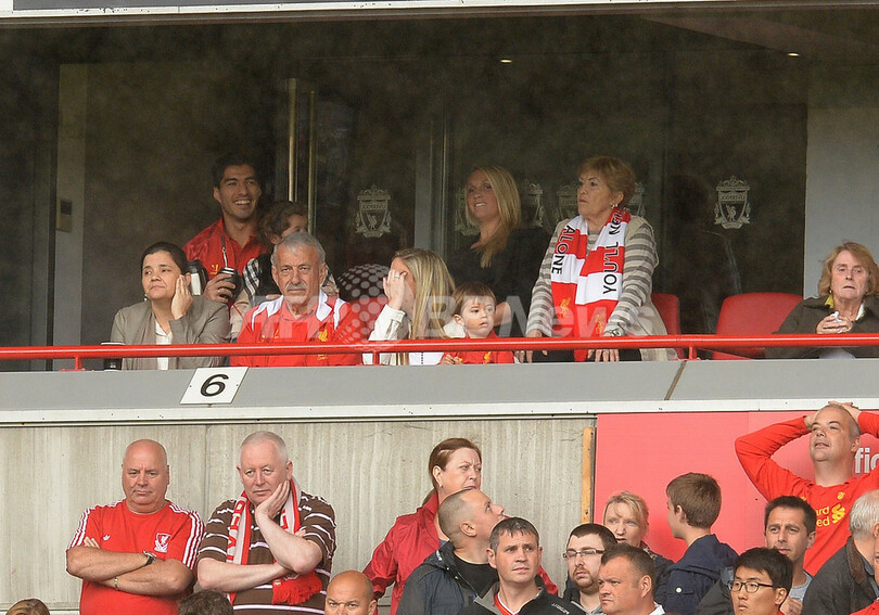 チェルシー(Chelsea)のブラニスラフ・イヴァノヴィッチ(Branislav Ivanovic)にかみついて出場停止処分を受けているスアレスはこの日、スタンドから試合を観戦した。欧州チャンピオンズリーグ(UEFA Champions League 2013-14)に出場できるクラブに移籍させる約束だったと主張していたスアレスは、一時は一人で練習するよう命じられていた。しかしながら、16日にはロジャーズ監督に自身の振る舞いについて謝罪をし、練習に復帰したと報じられている。(c)AFP
