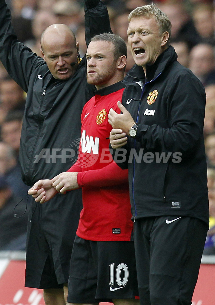 デビッド・モイーズ(David Moyes)監督のそばで交代出場を待つマンチェスター・ユナイテッドのウェイン・ルーニー(Wayne Rooney、中央、2013年8月17日撮影)。(c)AFP/IAN KINGTON