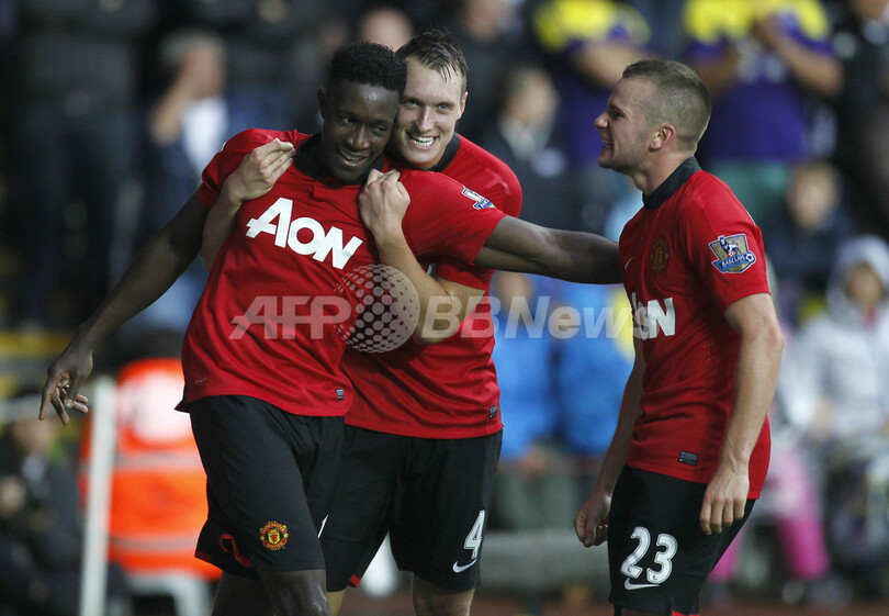 後半ロスタイムにチーム4得点目を挙げ、チームメートに祝福されるマンチェスター・ユナイテッドのダニー・ウェルベック(Danny Welbeck、2013年8月17日撮影)。(c)AFP/IAN KINGTON