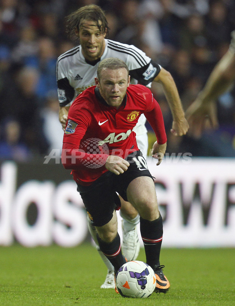 スウォンジーのミチュ(Miguel Perez Cuesta 'Michu')とボールを競るマンチェスター・ユナイテッドのウェイン・ルーニー(Wayne Rooney、2013年8月17日撮影)。(c)AFP/IAN KINGTON