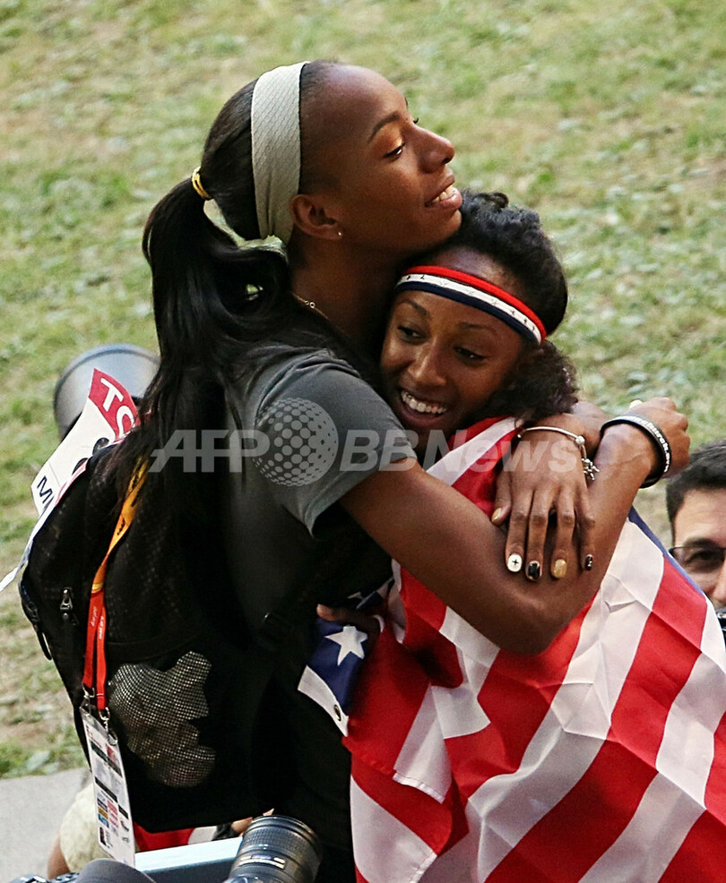 レース後、女子走り高跳びのブリジッタ・バレット(Brigetta Barrett)に祝福されるブリアナ・ロリンズ(、2013年8月17日撮影)。(c)AFP/LOIC VENANCE
