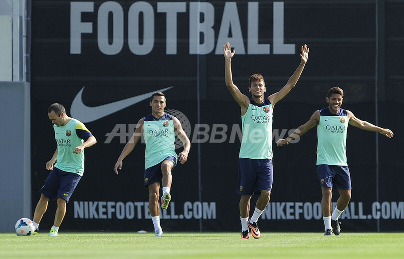 チームメートと一緒に練習に臨むネイマール(Neymar da Silva Santos Junior、2013年8月17日撮影)。(c)AFP/JOSEP LAGO