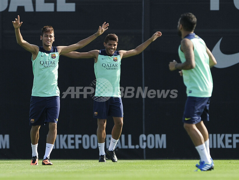 チームメートと一緒に練習に臨むネイマール(Neymar da Silva Santos Junior、2013年8月17日撮影)。(c)AFP/JOSEP LAGO