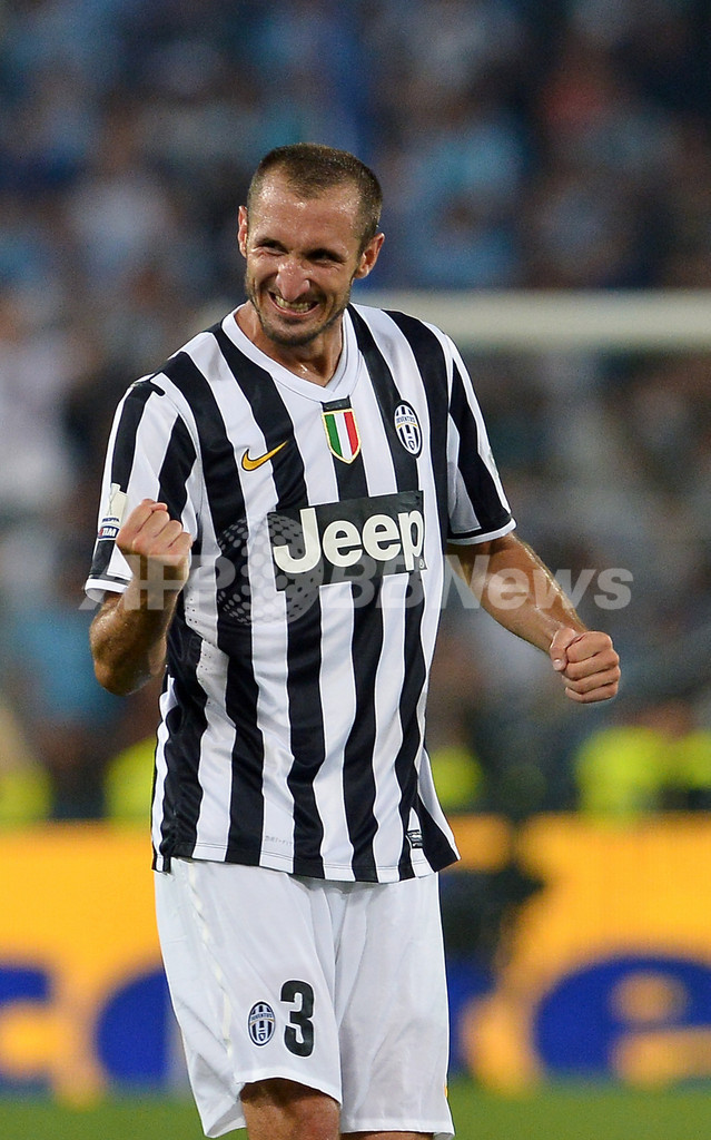 得点を挙げて喜ぶユベントスのジョルジョ・キエッリーニ(Giorgio Chiellini、2013年8月18日撮影)。(c)AFP/VINCENZO PINTO
