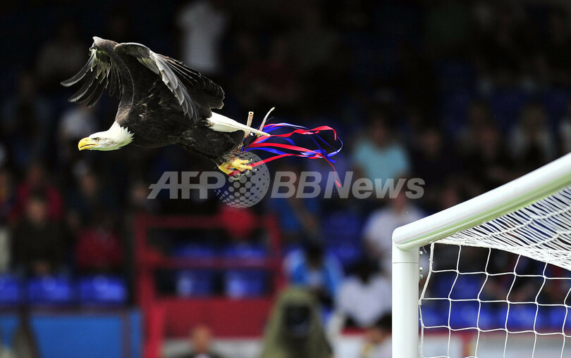 試合開始前に空を飛ぶクリスタルパレスのチームマスコットのケイラ(Kayla、2013年8月18日撮影)。(c)AFP/GLYN KIRK