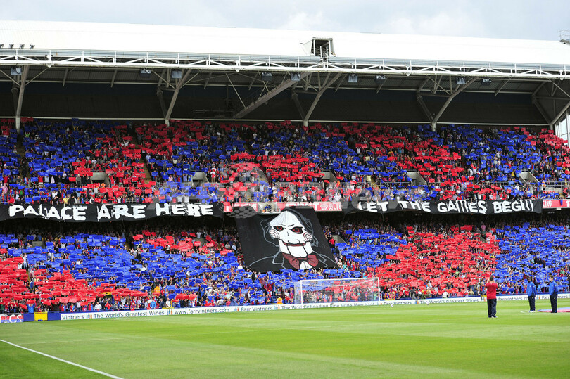 試合開始前に横断幕を広げるクリスタルパレスのファン(2013年8月18日撮影)。(c)AFP/GLYN KIRK