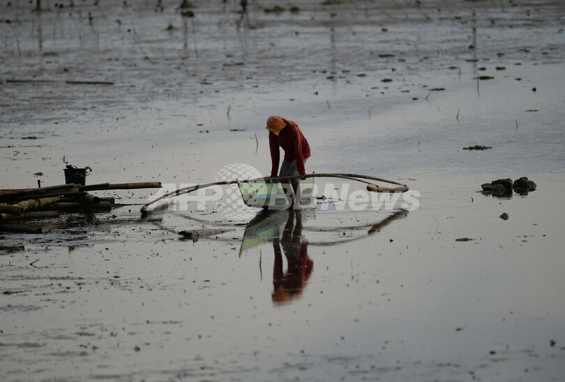 沈没現場から約5キロのマングローブ林を訪れたAFPの記者によると、干潮時にマングローブが黒い油で覆われ、油膜の張った浅い水面を鳥がもがくように進んでいたという。(c)AFP/Cecil MORELLA