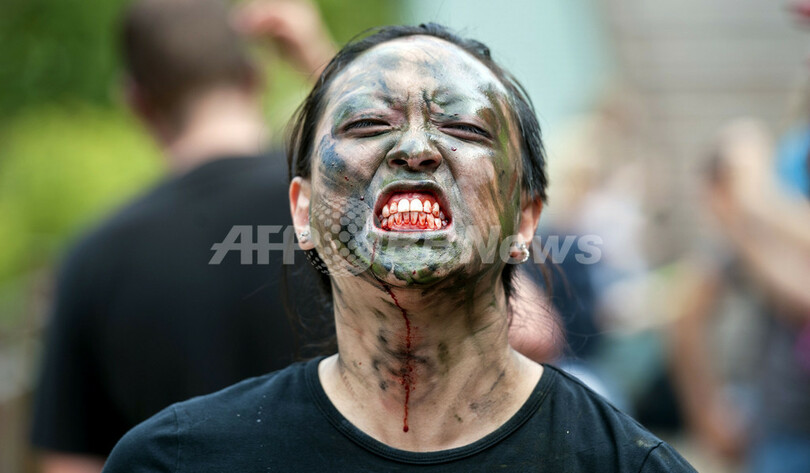 写真は、訓練のためゾンビに扮した女性(2013年8月18日撮影)。(c)AFP/WILL OLIVER